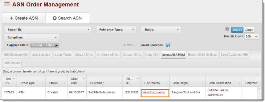 Certain documents, such as Bills of Lading or Pickup Lists (PULs), can be attached directly to an ASN through the associated shipment. These documents are scanned into the imaging system and associated with the Reference Types attached to the shipment. Once attached, these documents can be viewed from within ASN Management.