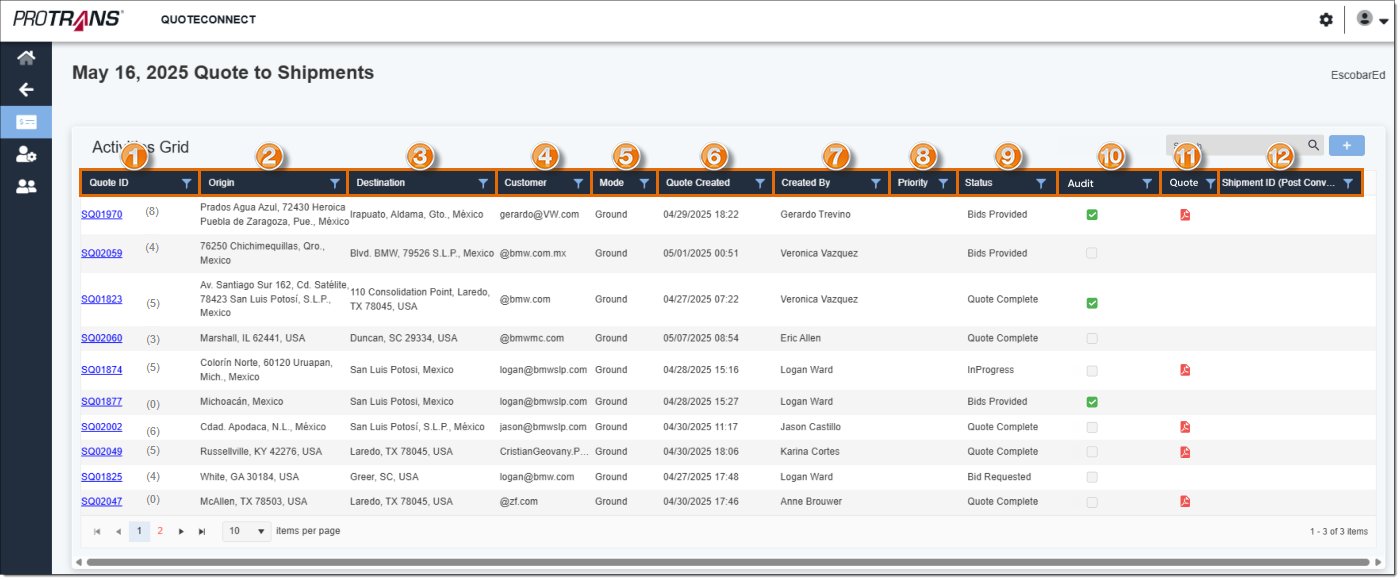 - Quote ID: The Spot Quote number for the quote. This number systematically generates when the quote is created and displays as a link. Click the link to see the details about the Spot Quote. The number in parenthesis next to the Quote ID indicates how many bid responses have been received for that Spot Quote.