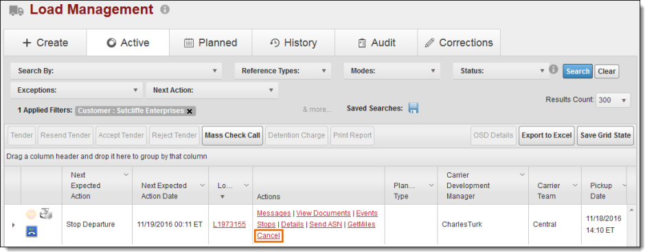 - Search for the load to be cancelled. See Search for Active Loads for details.
