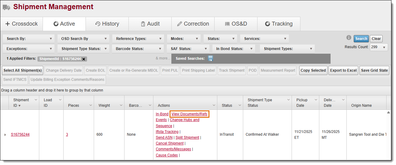 - Click View Documents/Refs for the selected shipment.