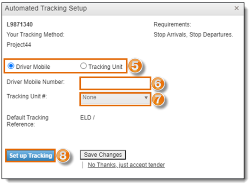 - Select Mobile or Tracking Unit # as a tracking method for the specific load.