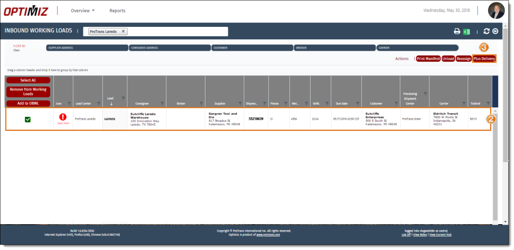 Delivery loads can be assigned in Optimiz to track the delivery of LTL shipments moving from the processing hub to the final destination. The reference values from each shipment are automatically assigned to the delivery load created for it. Before a shipment can be assigned a delivery trailer, the shipment must first be off loaded to the processing hub. If no delivery carrier is available, the delivery load must be created manually.