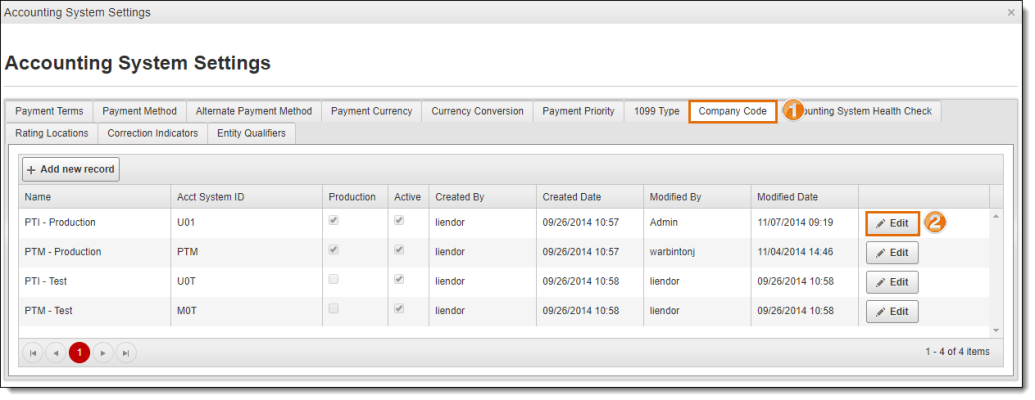 - Click Edit at the end of the row for the Company Code requiring updates.