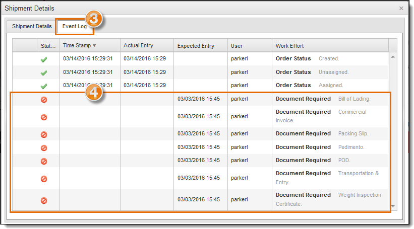 - All required documents are displayed in the Event Log, with a separate entry for each document that is missing.