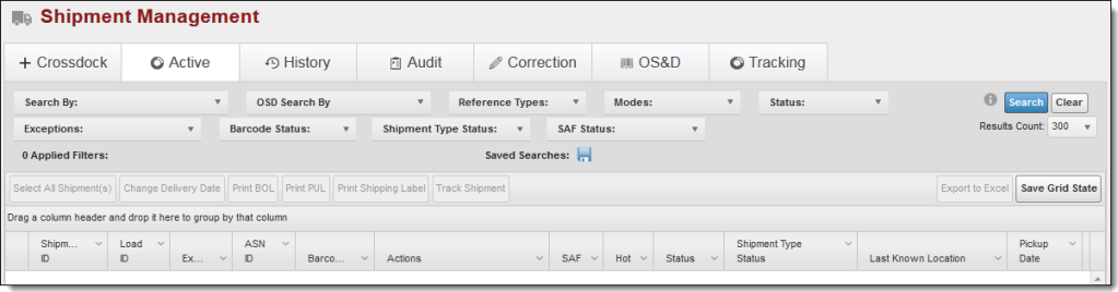 Shipment Management contains all shipments that are in an active status; that is, all shipments with a status from Unassigned to Delivered. Inactive shipments, or shipments with a status of Cancelled or Closed, are held in Shipment History.