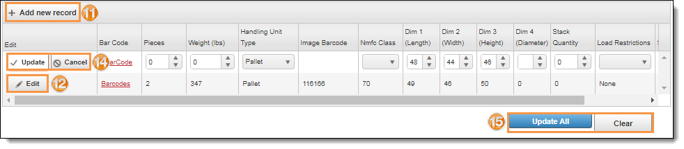 - Click Edit to modify the handling unit's information if needed. Scroll the handling unit information grid to the right if the Edit button is not visible.