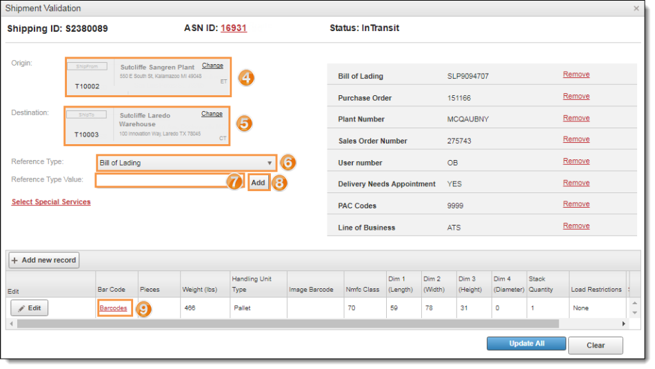 - Click Update All to validate the shipment, Clear to undo all changes, or Close to return to Shipment Management.