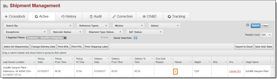 - Search for the shipment to be validated. See Search for Shipments for details.