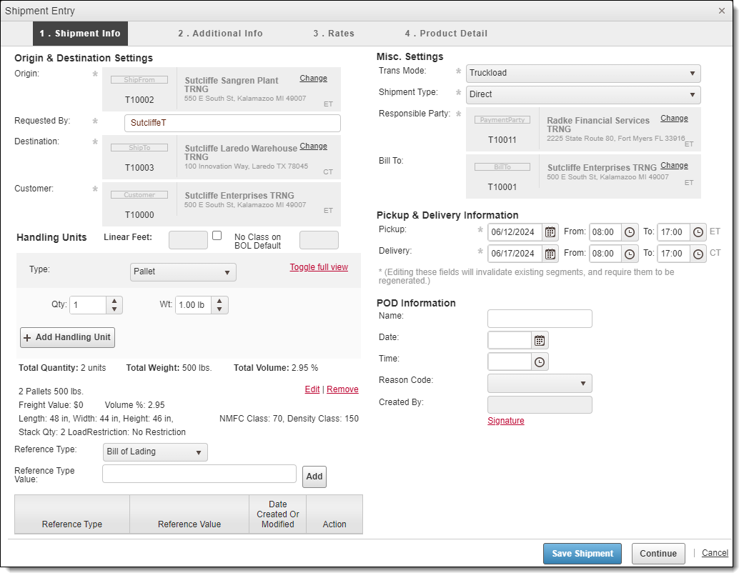 The handling units of a shipment describe what is physically being moved. Handling unit information must be accurate to properly plan trailer utilization and for customer billing. (If default shipment items are defined in the Customer Hierarchy for the selected O/D Pair, these fields fill automatically.) If specific reference types are required for the shipment, they will be listed above the list of references.