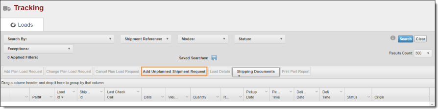 2. Click Add Unplanned Shipment Request on the action bar.
