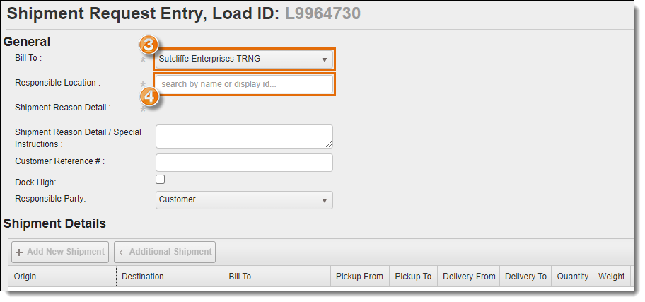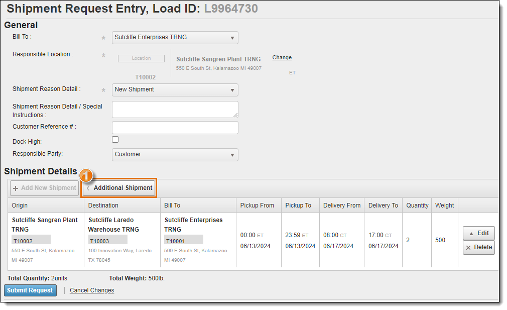 Additional shipments can be added to a single shipment request in cases where the load being requested has multiple stops (milk run) or is a round trip (beginning and ending at the same location).