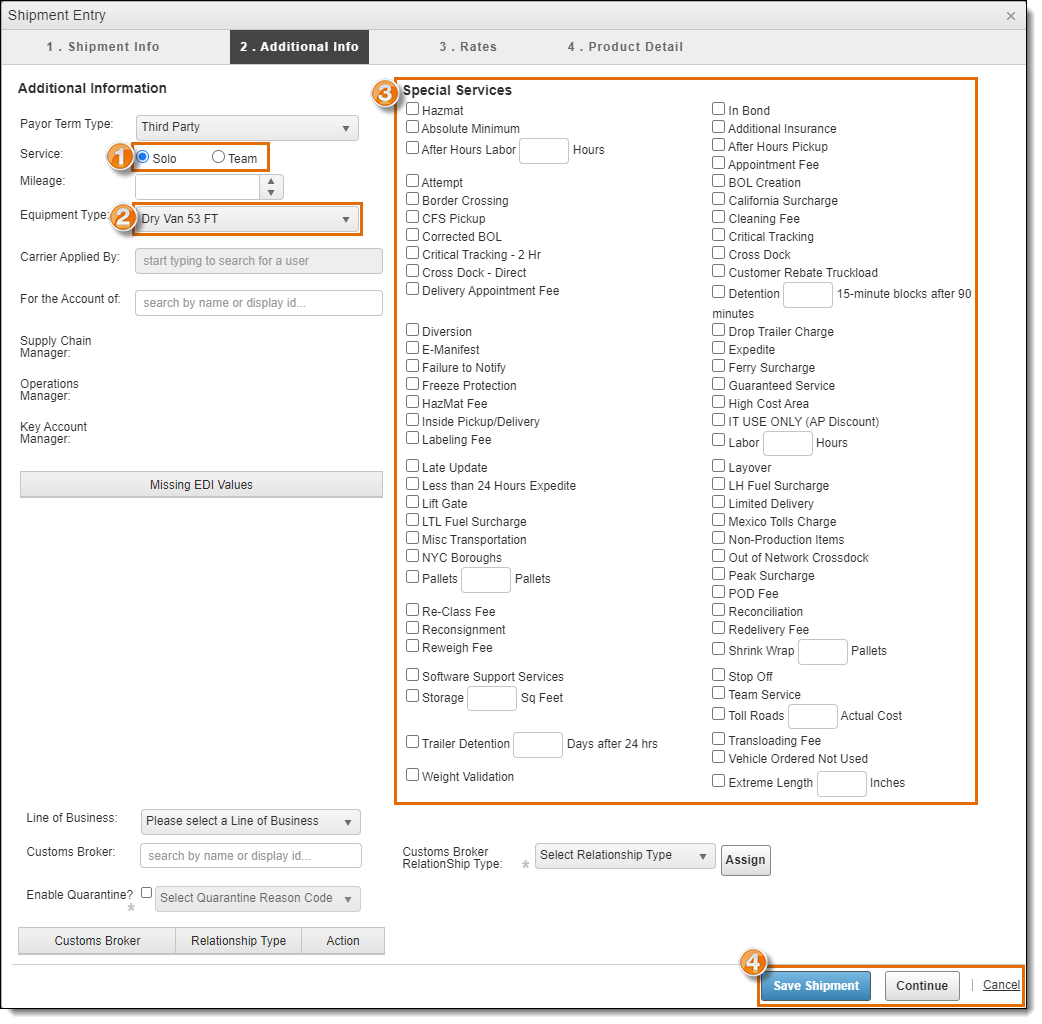 3. Enter the Pickup and Delivery Information as shown in the Shipment Info - Pickup & Delivery Information section above.