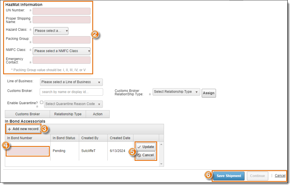 5. Click Update to save the In-Bond Number or Cancel to discard it.