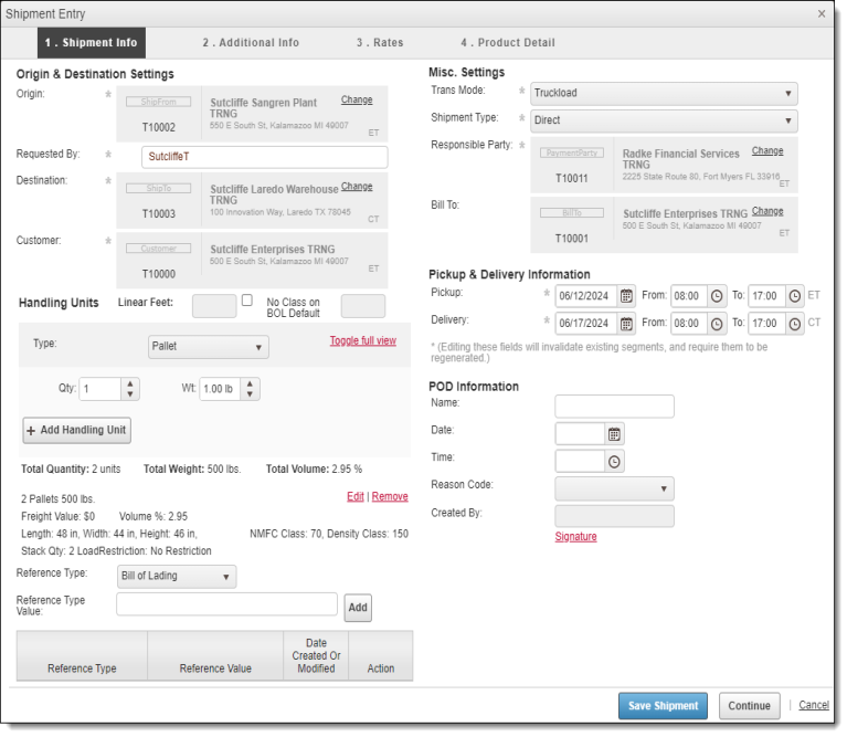 - Ingrese la información de recolección y entrega como se muestra en la sección Shipment Info - Pickup & Delivery Information más arriba.