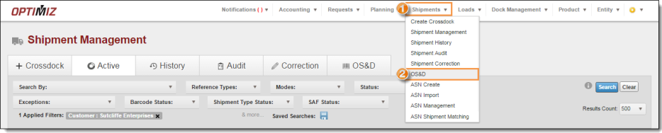 The Shipment Management page opens to the OS&D tab.