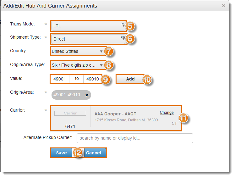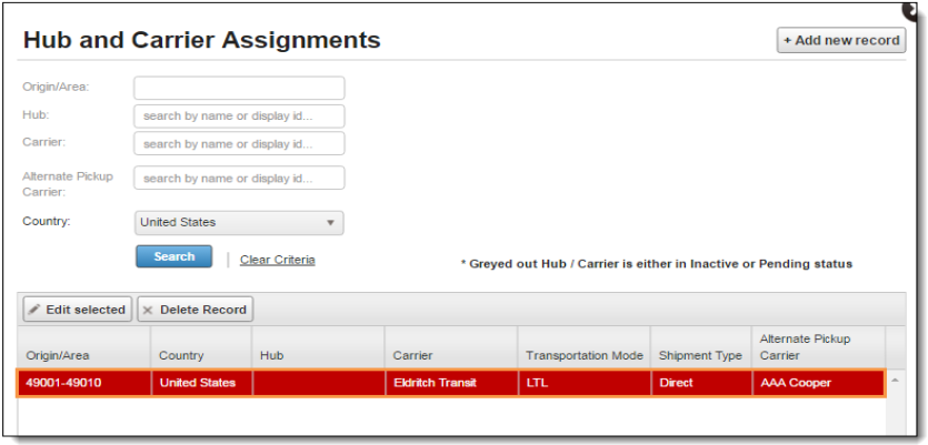 In addition, an Alternate Pickup Carrier may be assigned. This is the carrier assigned to pickup a shipment and deliver it to the Hub.