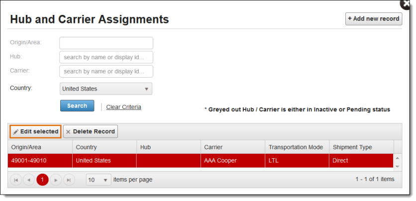 Searches for origin areas will only find matches of the same type as the provided criteria. For example, a search for the origin ZIP code 49048 will return assignments that include that ZIP code in their defined area, either as an exact ZIP code or as part of a range of ZIP codes. However, it will not return assignments that include the state Michigan, even though 49048 is a Michigan ZIP code. Likewise, a search for MI will return any assignment that includes Michigan, but will not return assignments that include Michigan ZIP codes.