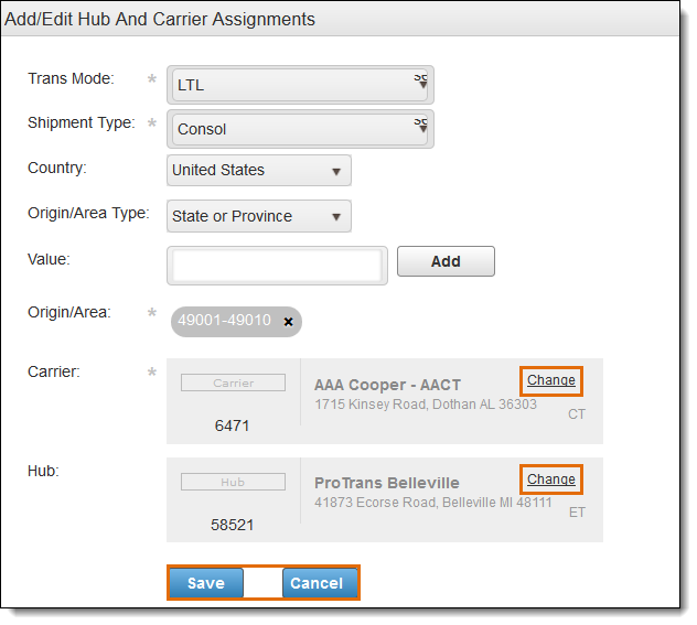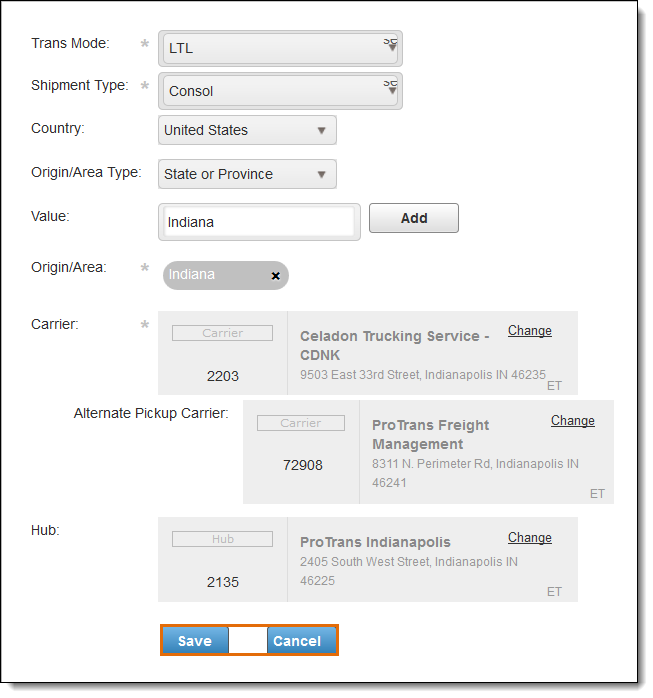 Assign a Hub and Carrier for LTL Consol shipments when an alternate carrier to the ProTrans designated carrier for that area and hub is to be used.