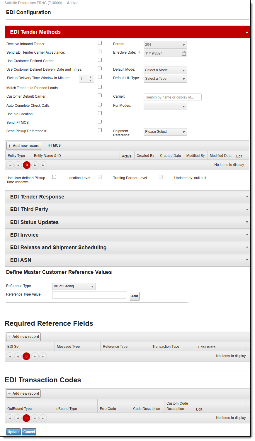 The Account Manager can set customer-specific defaults for EDI Configuration at the Customer or Bill To Level of the Customer Hierarchy. Configuration includes options that affect carrier requirements, delivery settings, check call updates, and customer specific error codes. Only users with the Admin role can edit EDI Configuration.