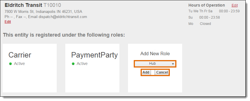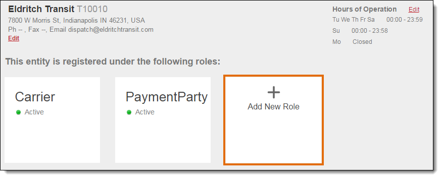 The new role has been added to the entity. Though most roles are immediately active, Carrier roles are created in an Inactive status. A Transportation Mode must be assigned to the carrier before it can be activated for use. See Add a Transportation Mode and Edit the Status of an Entity Role for details.
