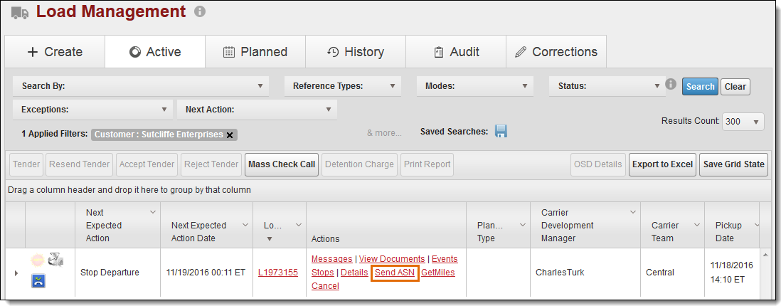 - Search for the load that includes the shipment attached to the ASN to be sent. See Search for Active Loads for details.
