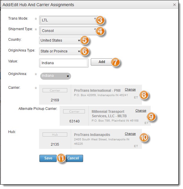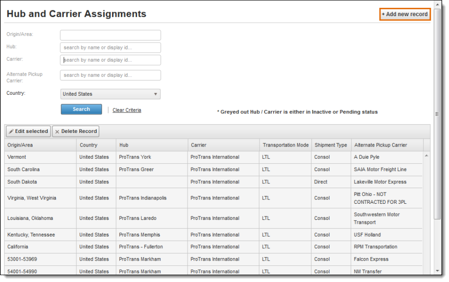 Only Superusers make this assignment. It refers to the Operational Hubs that default based on the geographic location of shipment origins. If the Carrier is left blank, Optimiz will perform a least-cost carrier lookup when shipments using the geographic location are created.