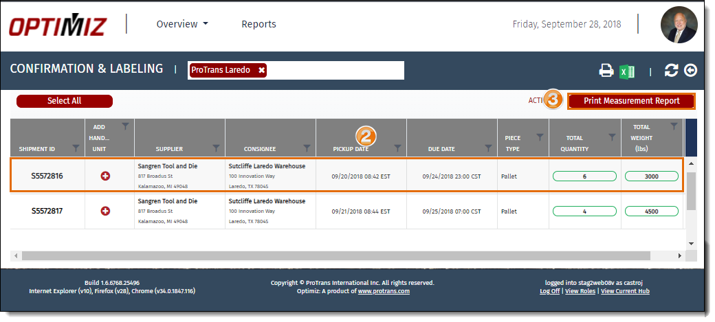 - Select the shipment or shipments that should appear on the measurement report. To select multiple shipments, press the CTRL key and select each shipment. To select several shipments that are adjacent to each other, click the first shipment and, while pressing the Shift key on the keyboard, click the last shipment.