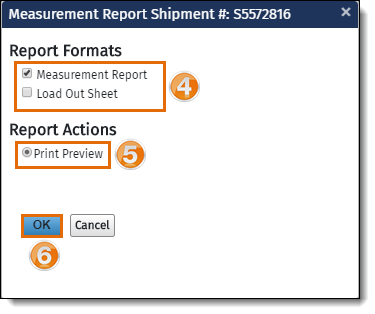 1. Select Measurement Report to print the measurement report. Select Load Out Sheet to print the load out sheet.